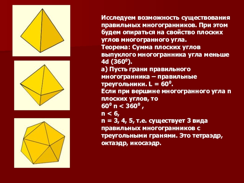 Слайд 3Исследуем возможность существования правильных многогранников. При этом будем опираться на свойство