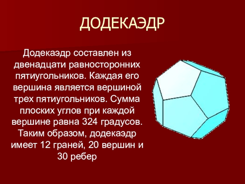 трех пятиугольников. Сумма плоских углов при каждой вершине равна 324 градусов. Таким образом, додекаэдр имеет 12 граней, 20 вершин и 30 ребер