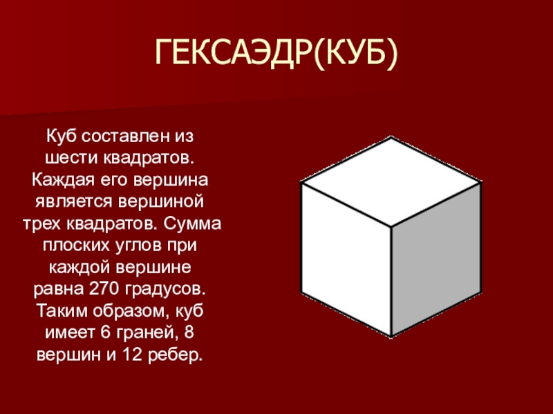 квадратов. Сумма плоских углов при каждой вершине равна 270 градусов. Таким образом, куб имеет 6 граней, 8 вершин и 12 ребер.