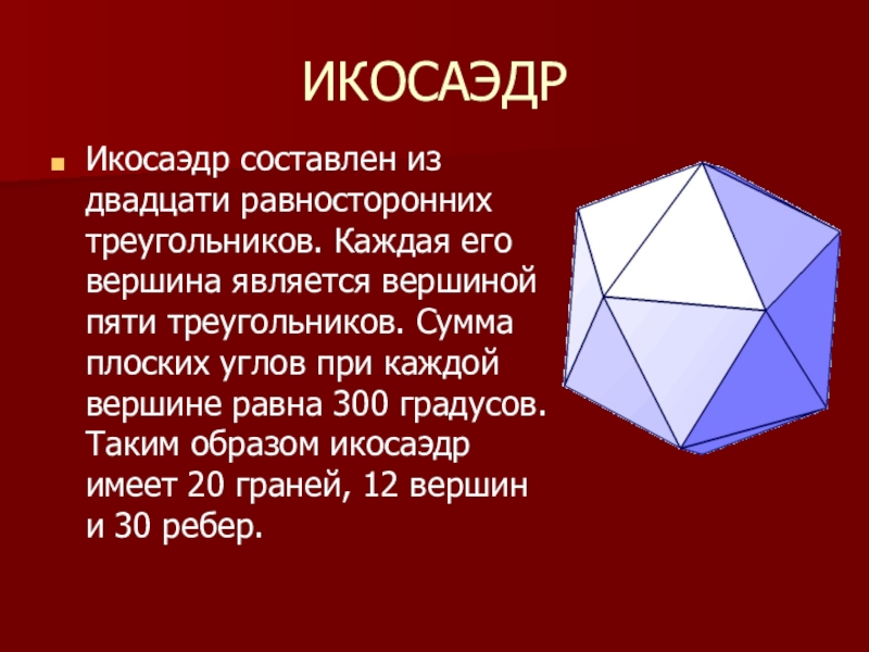пяти треугольников. Сумма плоских углов при каждой вершине равна 300 градусов. Таким образом икосаэдр имеет 20 граней, 12 вершин и 30 ребер.