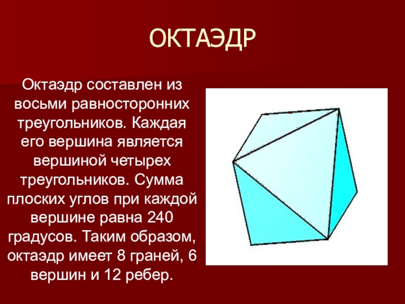 четырех треугольников. Сумма плоских углов при каждой вершине равна 240 градусов. Таким образом, октаэдр имеет 8 граней, 6 вершин и 12 ребер.