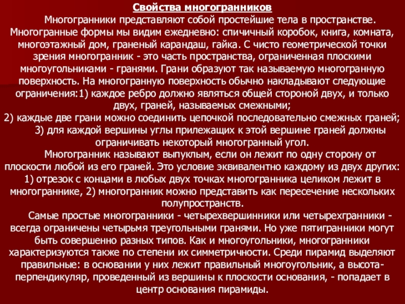 Многогранные формы мы видим ежедневно: спичичный коробок, книга, комната, многоэтажный дом, граненый карандаш, гайка. С чисто геометрической точки зрения многогранник - это часть пространства, ограниченная плоскими многоугольниками - гранями. Грани образуют так называемую многогранную поверхность. На многогранную поверхность обычно накладывают следующие ограничения:1) каждое ребро должно являться общей стороной двух, и только двух, граней, называемых смежными;