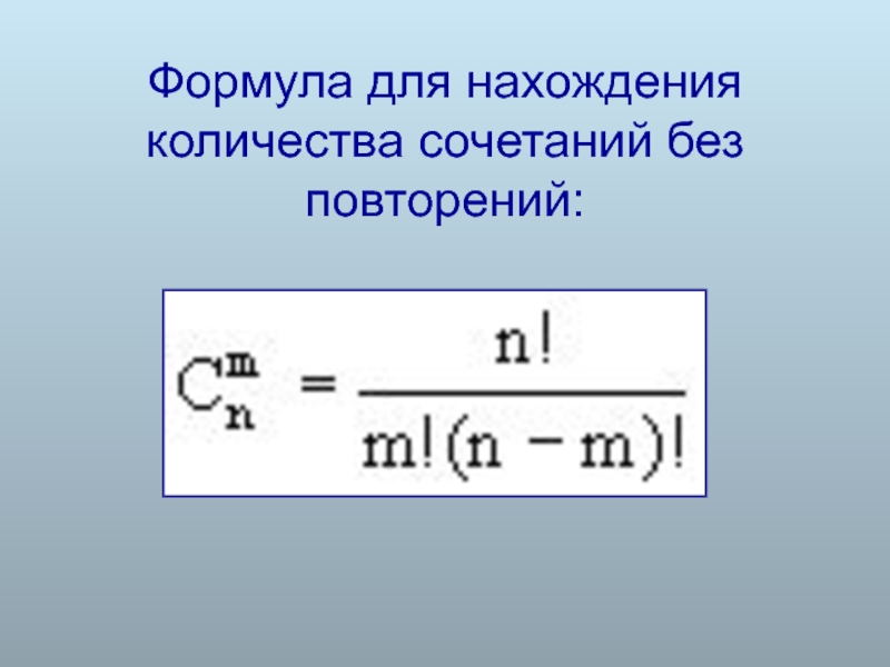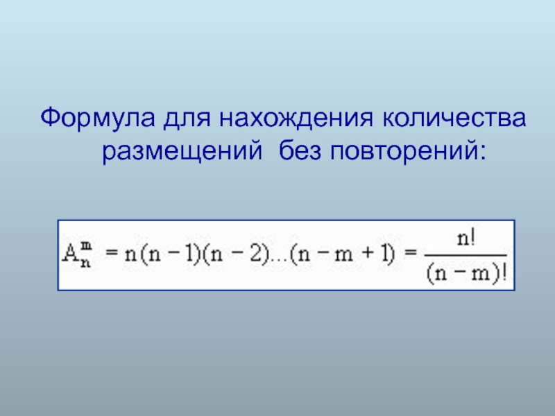 Слайд 40Формула для нахождения количества размещений без повторений: