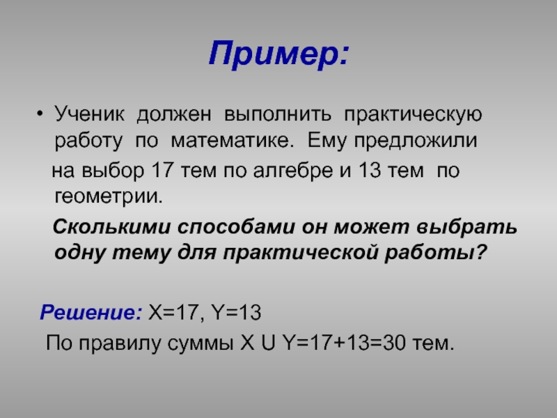 объект В можно выбрать n способами, то выбор «либо А, либо В» можно осуществить (m+n) способами.