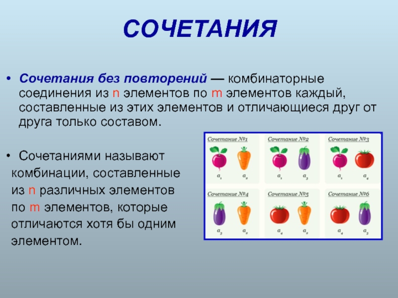 Сочетания без повторений — комбинаторные соединения из n элементов по m