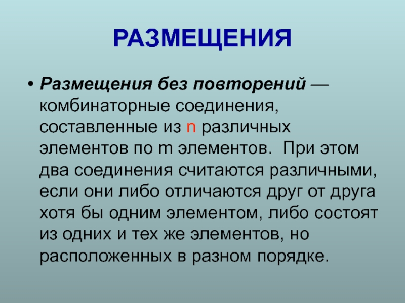 тех же n различных элементов, которые могут отличаться друг от друга лишь порядком входящих в них элементов.