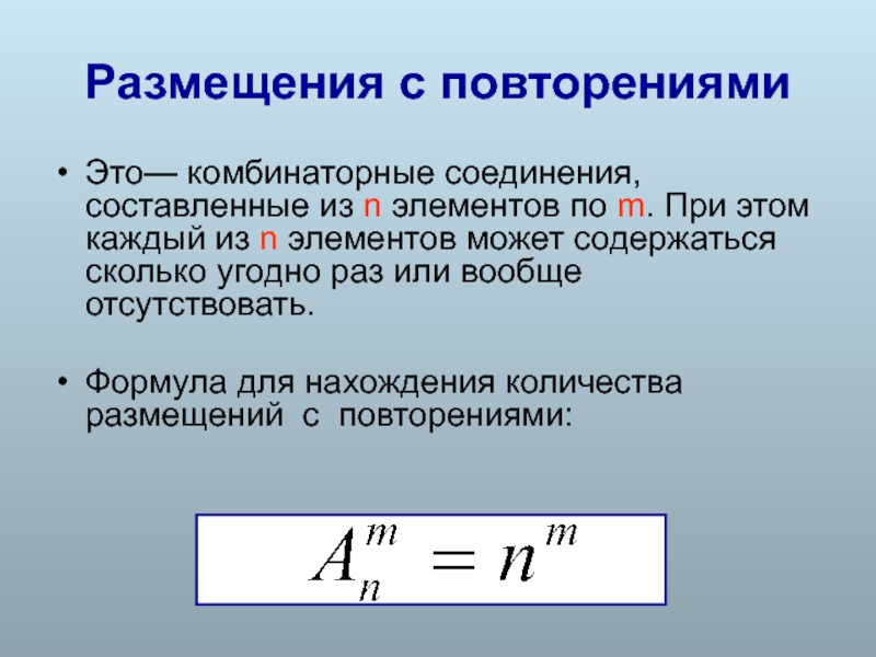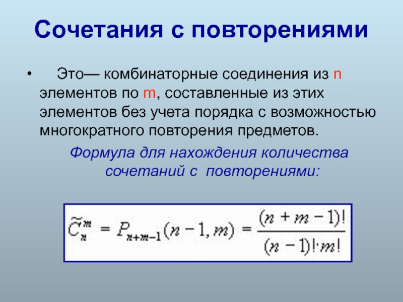 элементов по m, составленные из этих элементов без учета порядка с возможностью многократного повторения предметов.