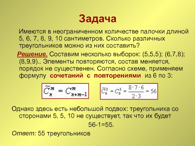 Решение. Составим несколько выборок: (5,5,5); (6,7,8); (8,9,9).. Элементы повторяются, состав меняется, порядок не существенен. Согласно схеме, применяем формулу сочетаний с повторениями из 6 по 3:
