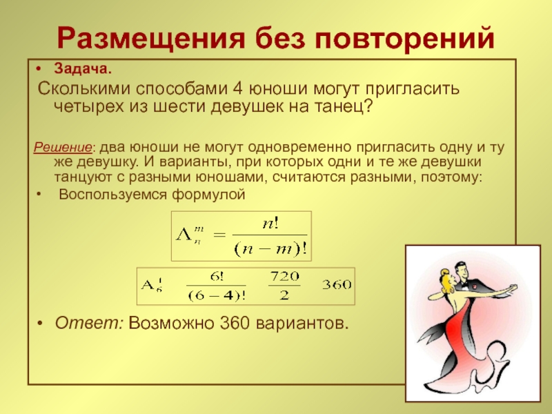 Решение: два юноши не могут одновременно пригласить одну и ту же девушку. И варианты, при которых одни и те же девушки танцуют с разными юношами, считаются разными, поэтому: