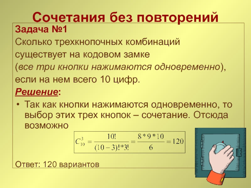 Так как кнопки нажимаются одновременно, то выбор этих трех кнопок – сочетание. Отсюда возможно