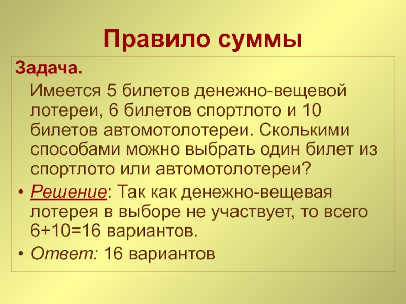 Решение: Так как денежно-вещевая лотерея в выборе не участвует, то всего 6+10=16 вариантов.