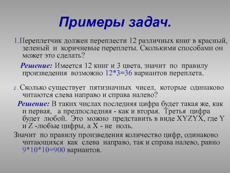 Решение: Имеется 12 книг и 3 цвета, значит по правилу произведения возможно 12*3=36 вариантов переплета.