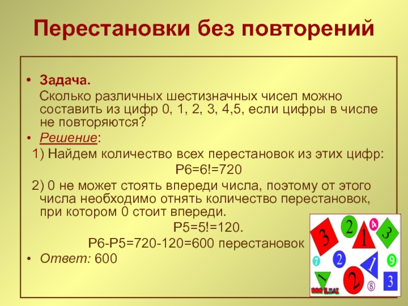 2) 0 не может стоять впереди числа, поэтому от этого числа необходимо отнять количество перестановок, при котором 0 стоит впереди.