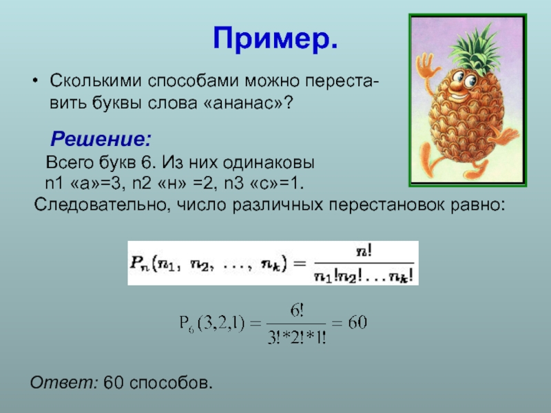 Решение Обозначая фрукты по первым буквам названия, составим несколько вариантов выдачи: ЯЯГГГАААА, ААГГЯГААЯ, ГГГААЯЯАА. Эти выборки имеют один и тот же состав и отличаются только перестановкой элементов, поэтому применяем формулу числа перестановок с повторениями