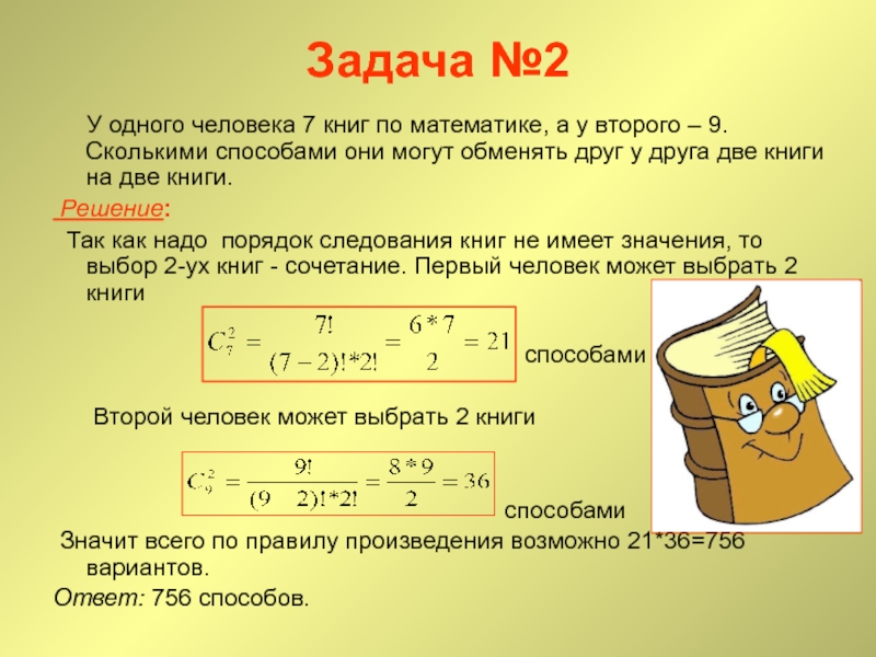 а у второго – 9. Сколькими способами они могут обменять друг у друга две книги на две книги.