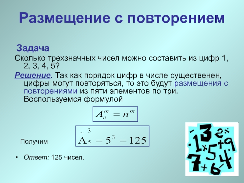 Решение. Так как порядок цифр в числе существенен, цифры могут повторяться, то это будут размещения с повторениями из пяти элементов по три. Воспользуемся формулой