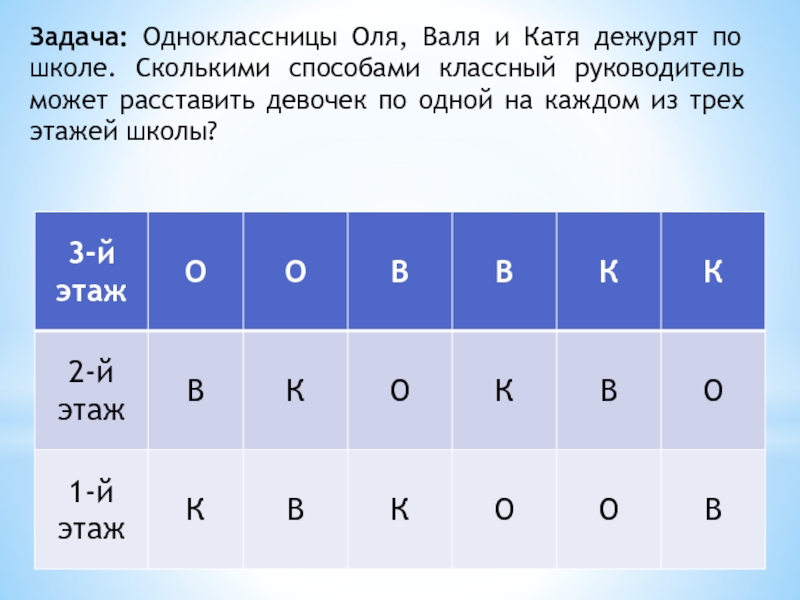 Слайд 10Задача: Одноклассницы Оля, Валя и Катя дежурят по школе. Сколькими способами