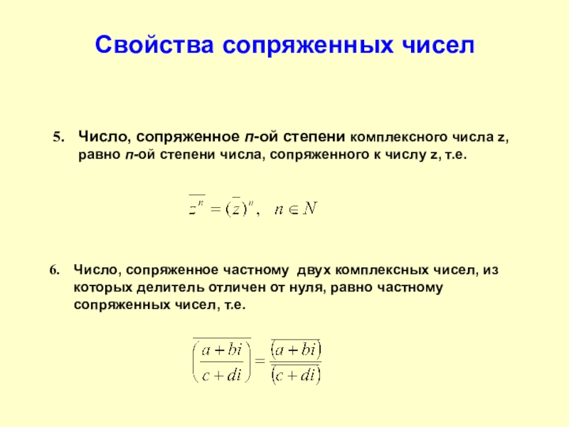 Число, сопряженное частному двух комплексных чисел, из которых делитель отличен от нуля, равно частному сопряженных чисел, т.е.
