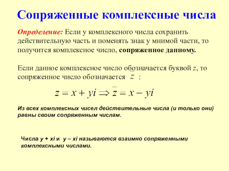 Числа y + xi и y – xi называются взаимно сопряженными комплексными числами.