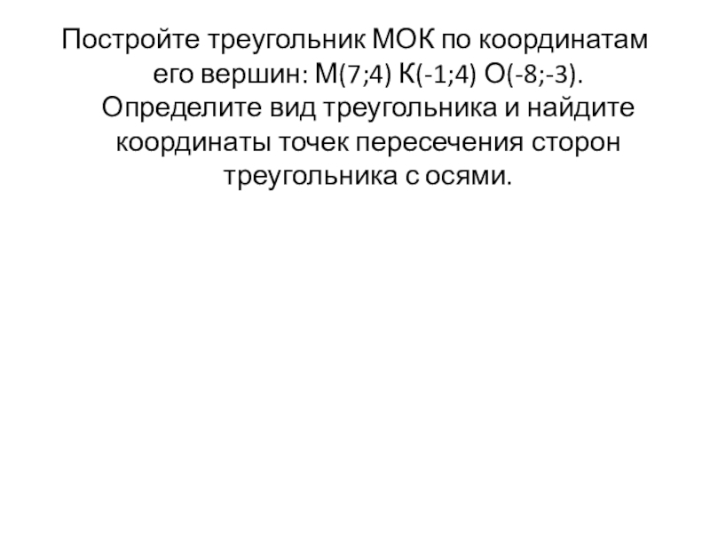 Слайд 7Постройте треугольник МОК по координатам его вершин: М(7;4) К(-1;4) О(-8;-3). Определите