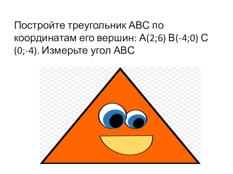 Слайд 6 Постройте треугольник АВС по координатам его вершин: А(2;6) В(-4;0) С(0;-4). Измерьте