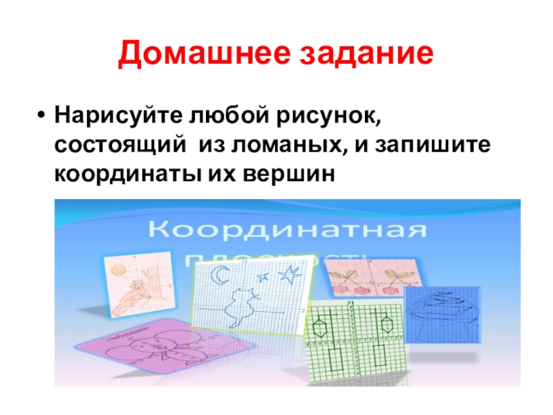 Домашнее заданиеНарисуйте любой рисунок, состоящий из ломаных, и запишите координаты их вершин
