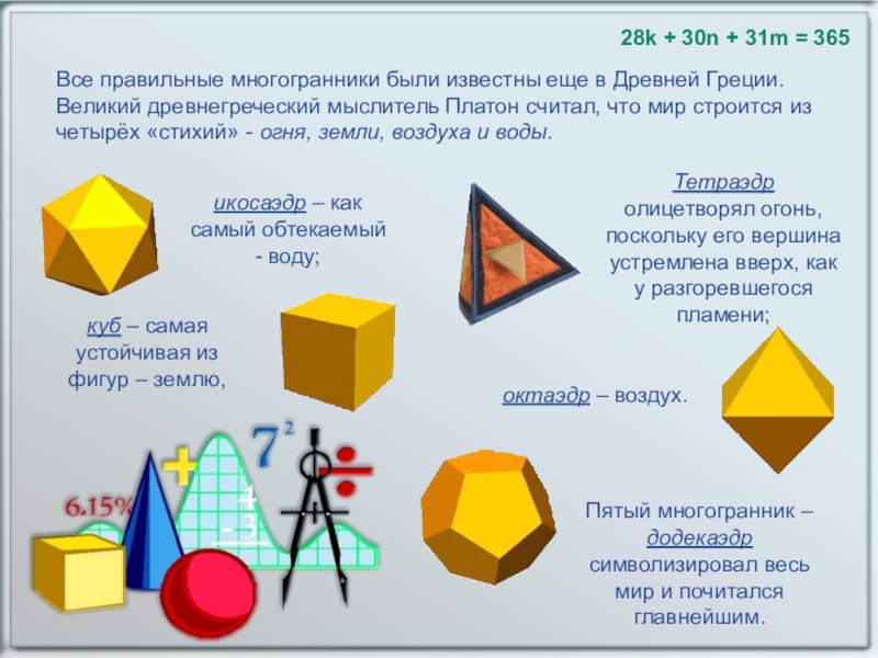 Все правильные многогранники были известны еще в Древней Греции. Великий древнегреческий мыслитель Платон считал, что мир строится из четырёх «стихий» - огня, земли, воздуха и воды.