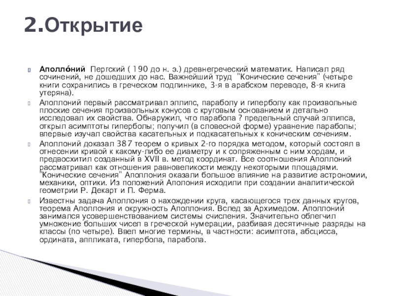 Аполлоний первый рассматривал эллипс, параболу и гиперболу как произвольные плоские сечения произвольных конусов с круговым основанием и детально исследовал их свойства. Обнаружил, что парабола ? предельный случай эллипса, открыл асимптоты гиперболы; получил (в словесной форме) уравнение параболы; впервые изучал свойства касательных и подкасательных к коническим сечениям.