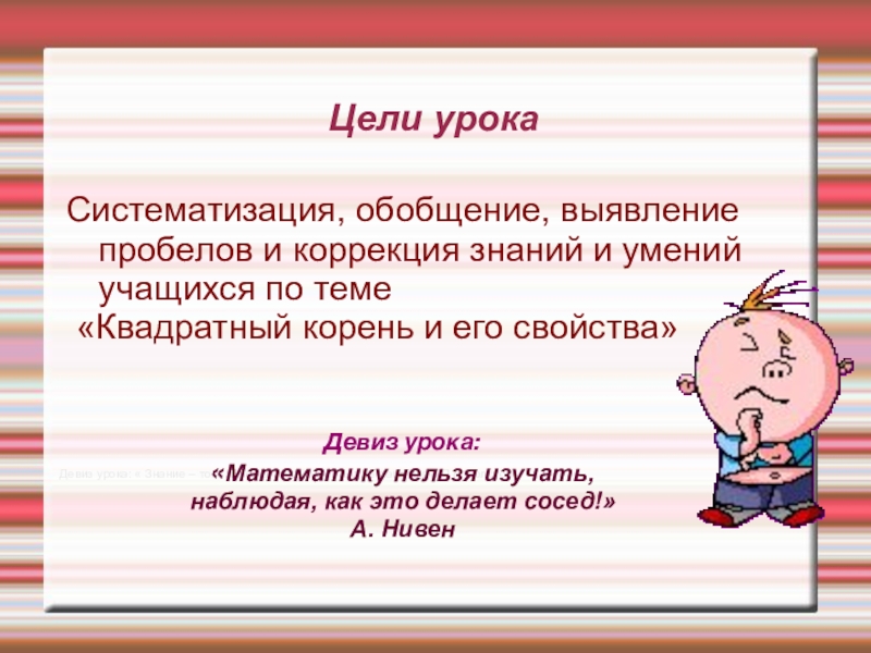 Девиз урока: « Знание – только тогда звоей мысли, а не памятью». Л.Н. Толстой.