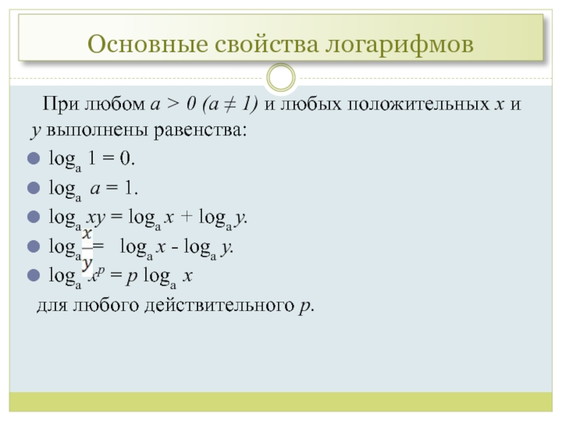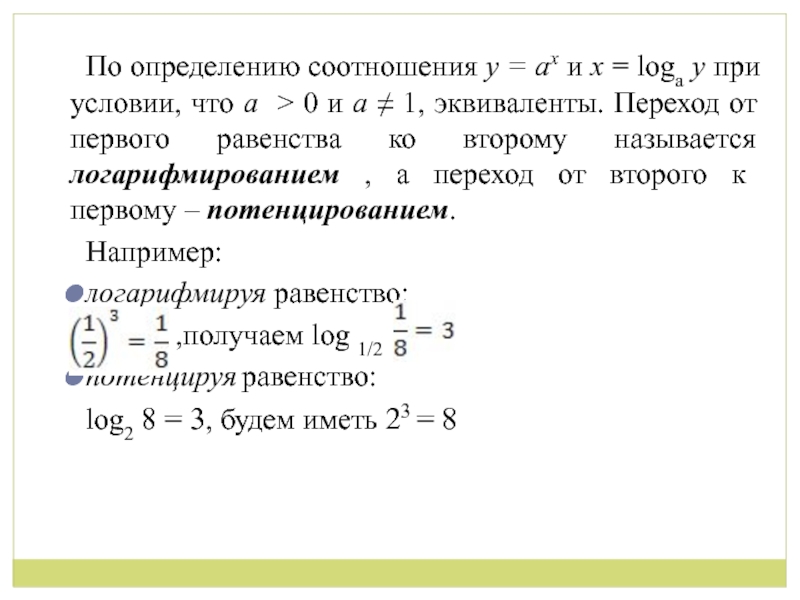 при условии, что a > 0 и a ≠ 1, эквиваленты. Переход от первого равенства ко второму называется логарифмированием , а переход от второго к первому – потенцированием.