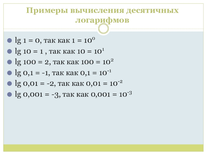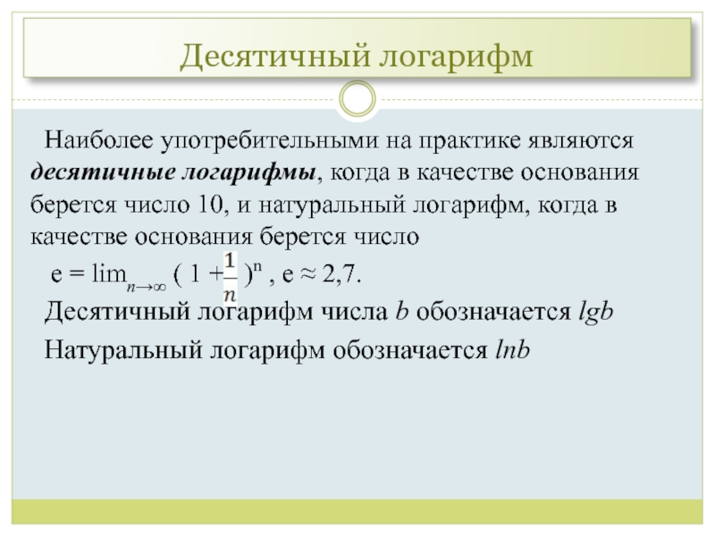 Наиболее употребительными на практике являются десятичные логарифмы, когда в качестве