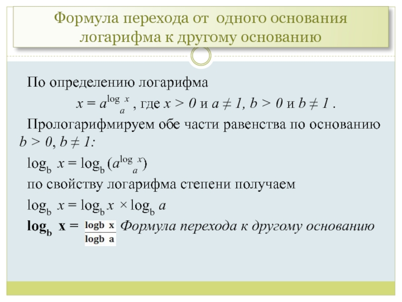 Слайд 8Формула перехода от одного основания логарифма к другому основанию