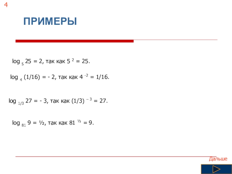 log 4 (1/16) = - 2, так как 4 -2 = 1/16.