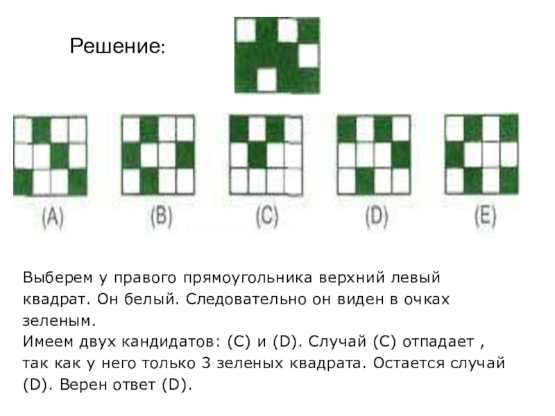 Все фигуры (кроме (D)) складываются из двух заготовок путем поворота одной из них на 180 градусов. Фигуру (D) нельзя составить из заготовок. Верен ответ (D).