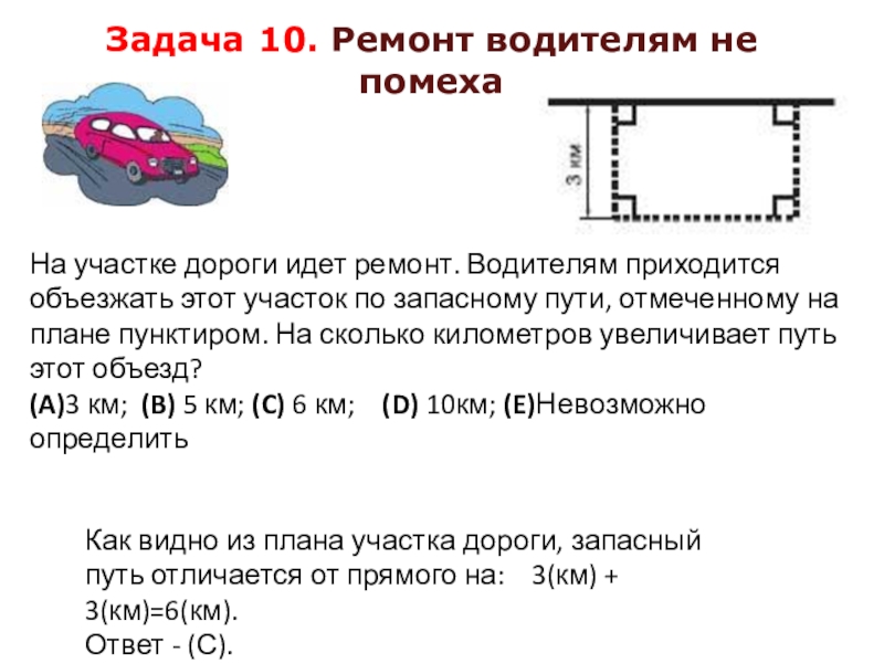Как видно из плана участка дороги, запасный путь отличается от прямого на: 3(км) + 3(км)=6(км). Ответ - (С).