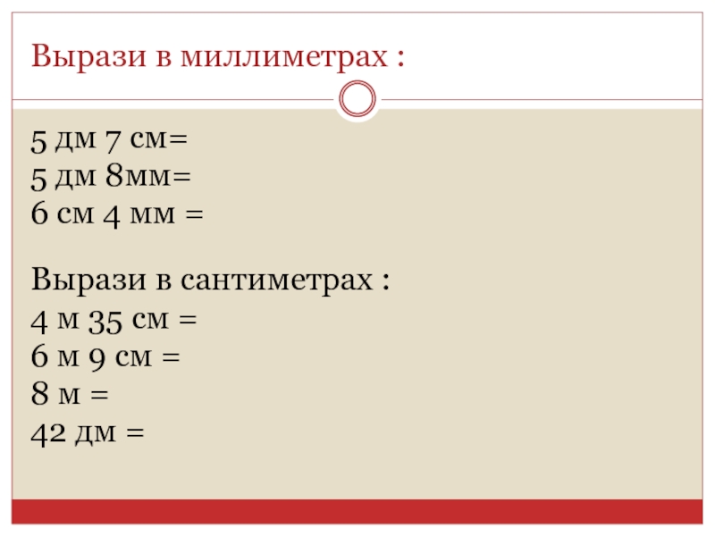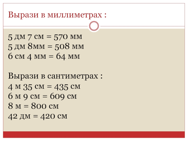 Вырази в миллиметрах :5 дм 7 см= 5 дм 8мм=6 см 4 мм =Вырази в сантиметрах :4