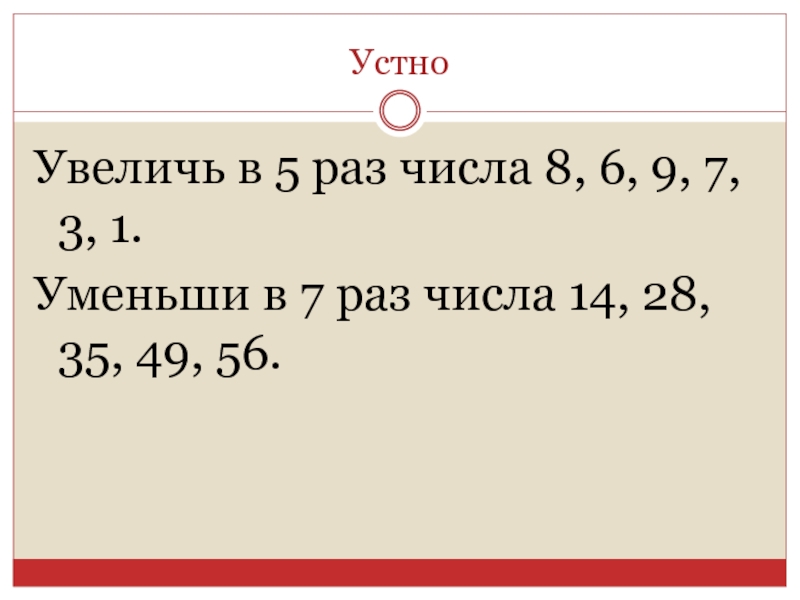 Устно Увеличь в 5 раз числа 8, 6, 9, 7, 3, 1.Уменьши в 7 раз числа 14, 28, 35, 49, 56.