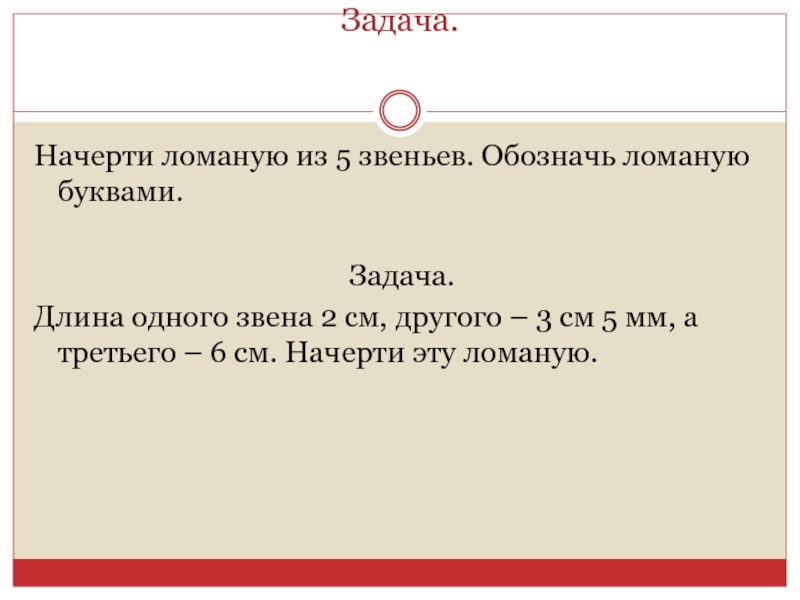Задача. Начерти ломаную из 5 звеньев. Обозначь ломаную буквами. Задача.Длина одного звена 2 см, другого – 3