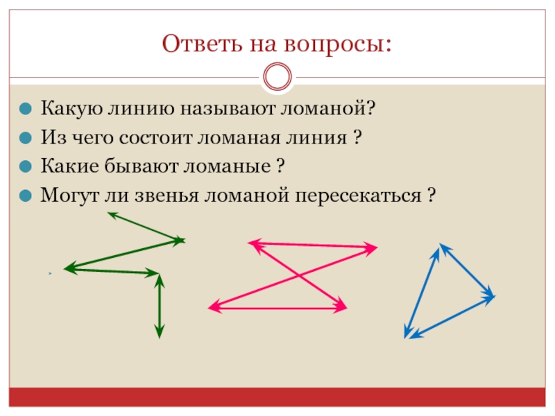 Ответь на вопросы:Какую линию называют ломаной?Из чего состоит ломаная линия ?Какие бывают ломаные ?Могут ли звенья ломаной