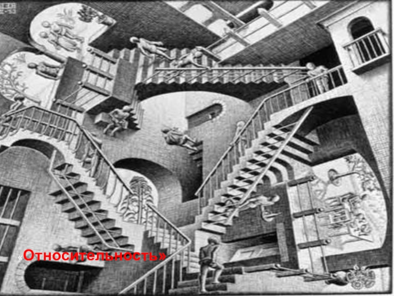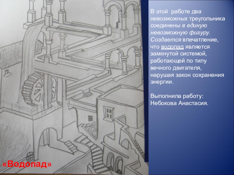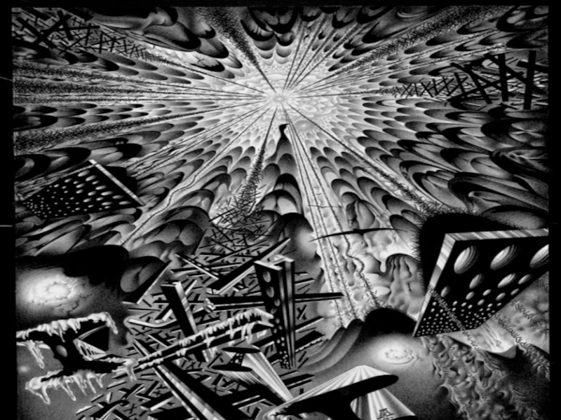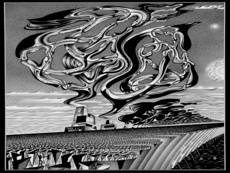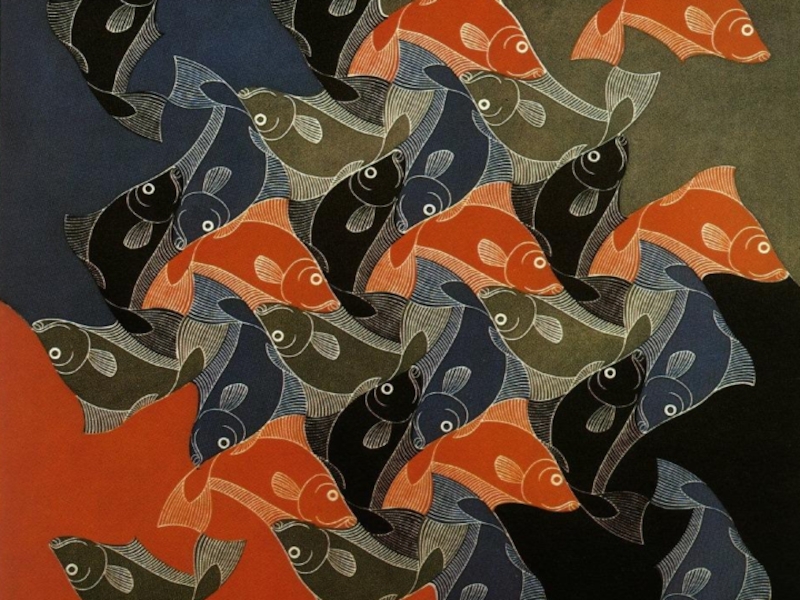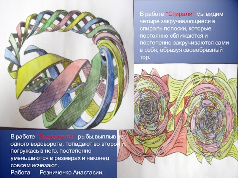 В работе “Водовороты” рыбы,выплыв из одного водоворота, попадают во второй и, погружась в него, постепенно уменьшаются в размерах и наконец совсем исчезают.
