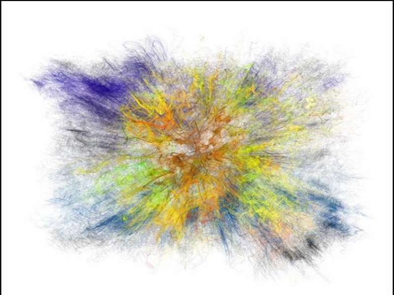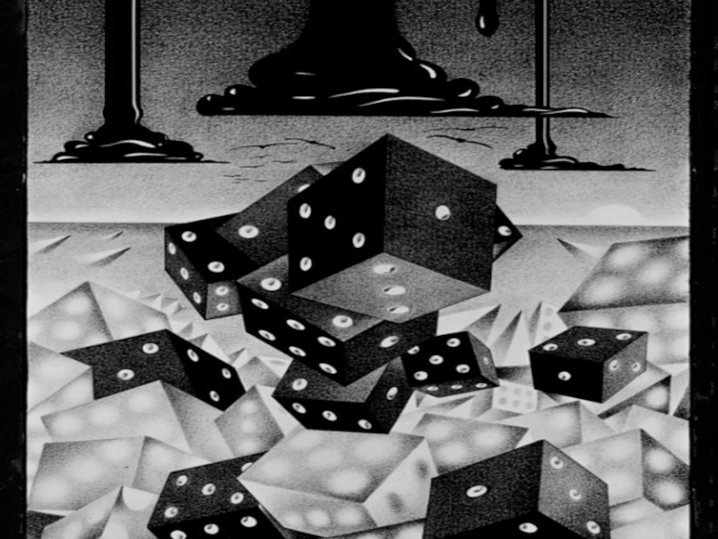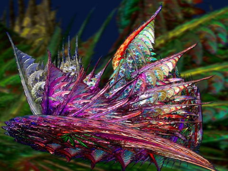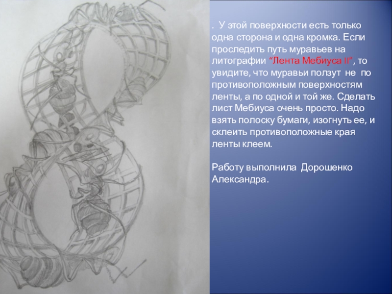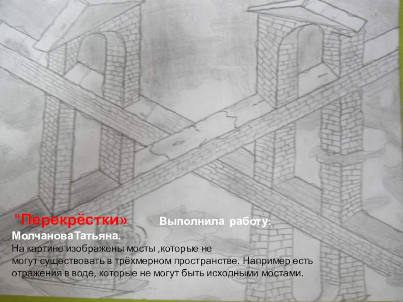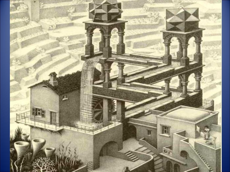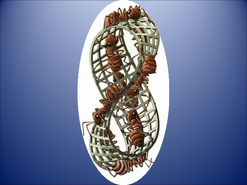 В работе “Водовороты” рыбы,выплыв из одного водоворота, попадают во второй и, погружась в него, постепенно уменьшаются в размерах и наконец совсем исчезают.