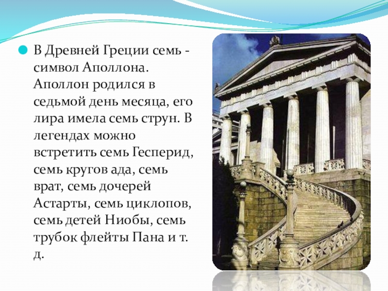 Слайд 9В Древней Греции семь - символ Аполлона. Аполлон родился в седьмой