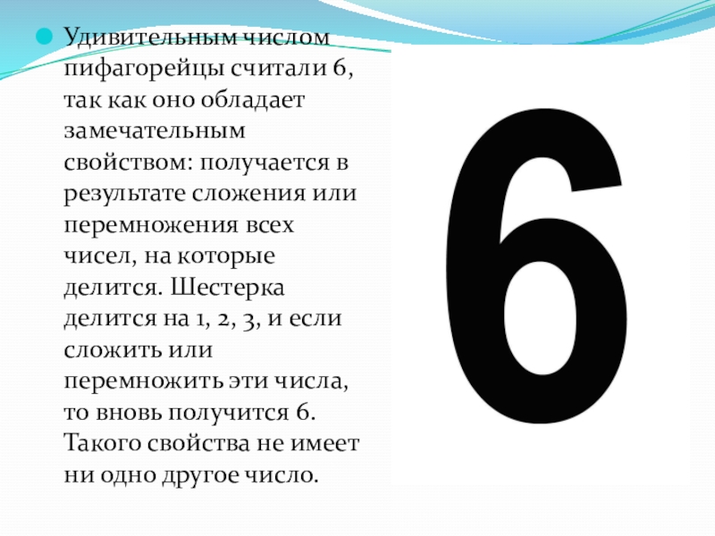 Удивительным числом пифагорейцы считали 6, так как оно обладает замечательным свойством: