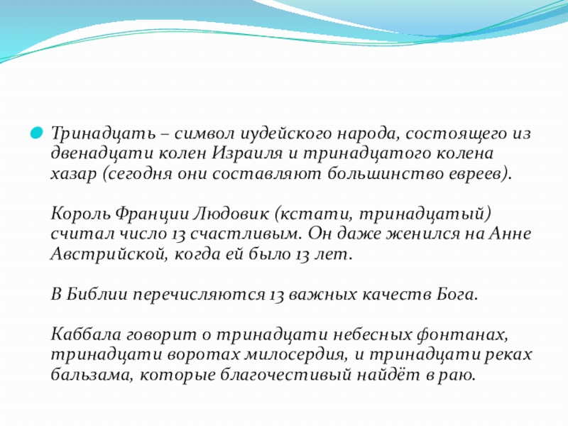 Слайд 25Тринадцать – символ иудейского народа, состоящего из двенадцати колен Израиля и