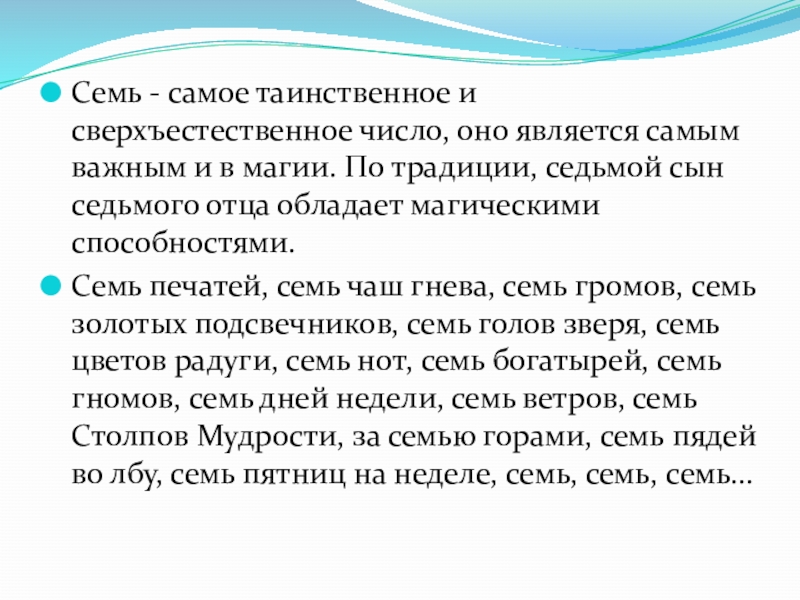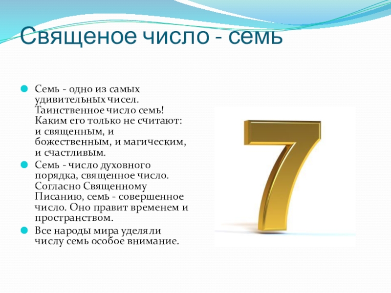 Слайд 11Семь - самое таинственное и сверхъестественное число, оно является самым важным