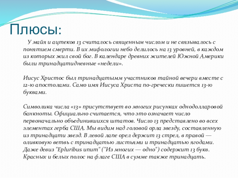 считалось священным числом и не связывалось с понятием смерти. В их мифологии небо делилось на 13 уровней, в каждом из которых жил свой бог. В календаре древних жителей Южной Америки были тринадцатидневные «недели».