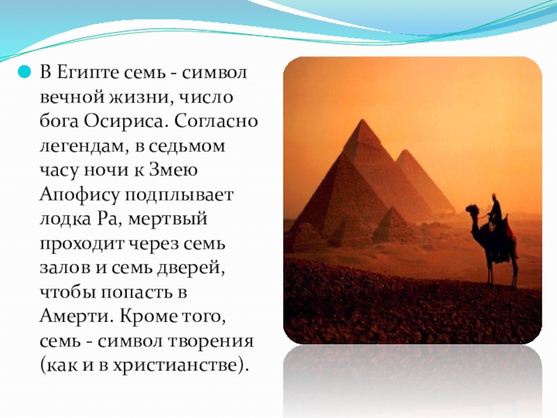 Слайд 8В Египте семь - символ вечной жизни, число бога Осириса. Согласно