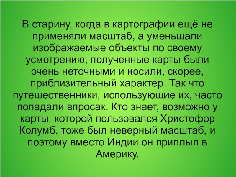 изображаемые объекты по своему усмотрению, полученные карты были очень неточными и носили, скорее, приблизительный характер. Так что путешественники, использующие их, часто попадали впросак. Кто знает, возможно у карты, которой пользовался Христофор Колумб, тоже был неверный масштаб, и поэтому вместо Индии он приплыл в Америку.