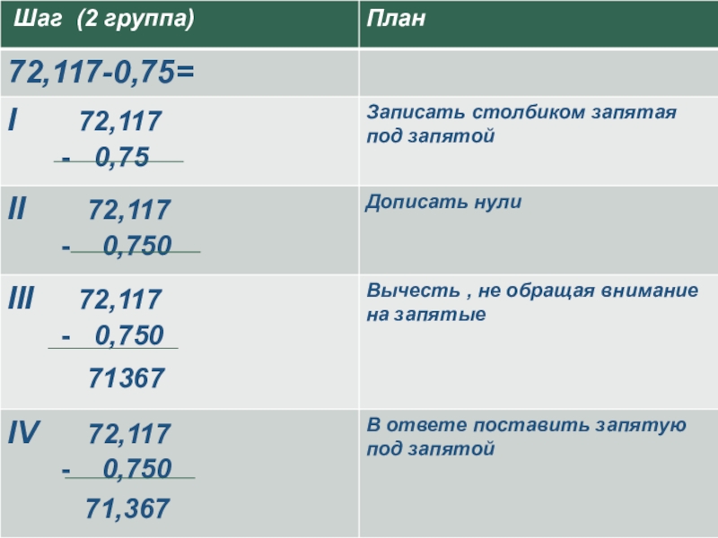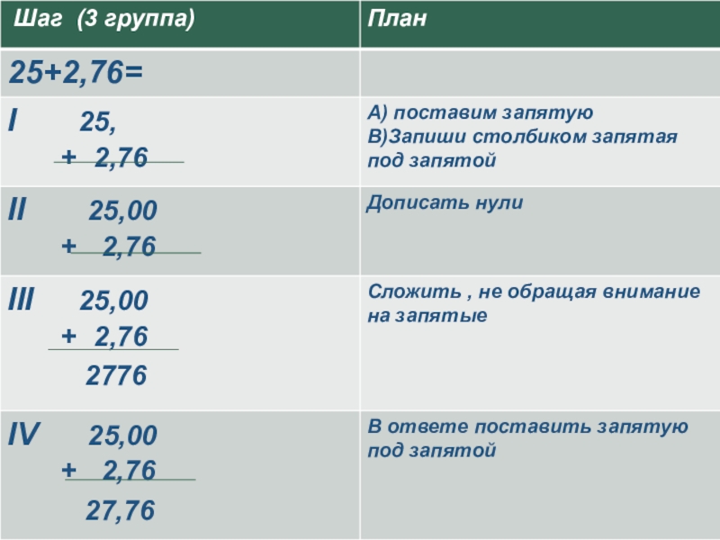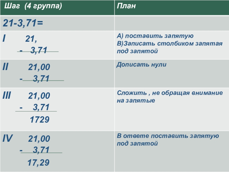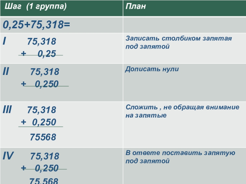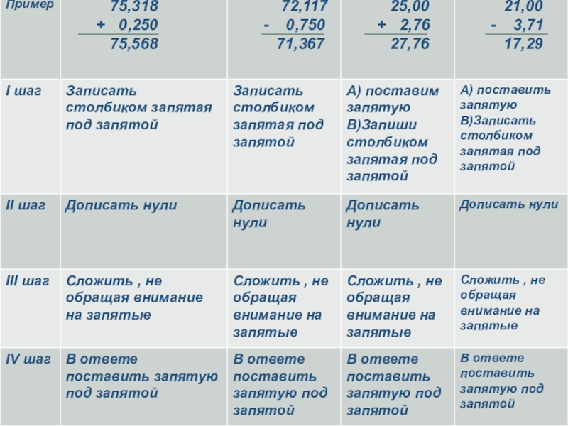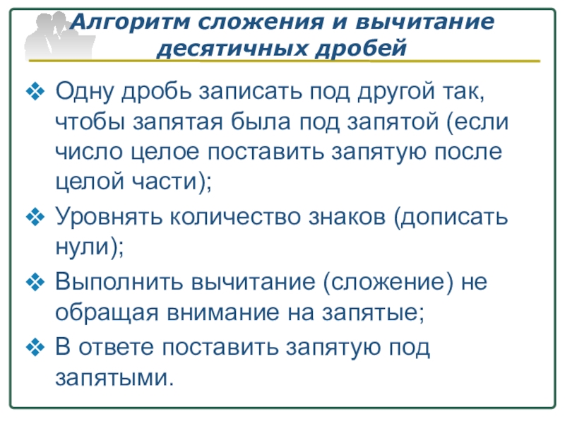Алгоритм сложения и вычитание десятичных дробейОдну дробь записать под другой так, чтобы запятая была под запятой (если