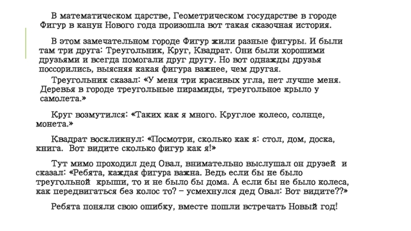В математическом царстве, Геометрическом государстве в городе Фигур в канун Нового года произошла вот такая сказочная история. В этом замечательном городе Фигур жили разные фигуры. И были там три друга: Треугольник, Круг, Квадрат. Они были